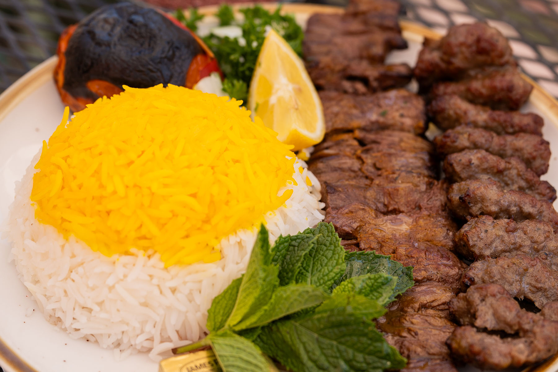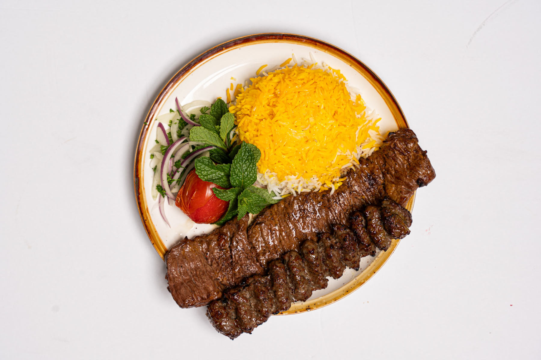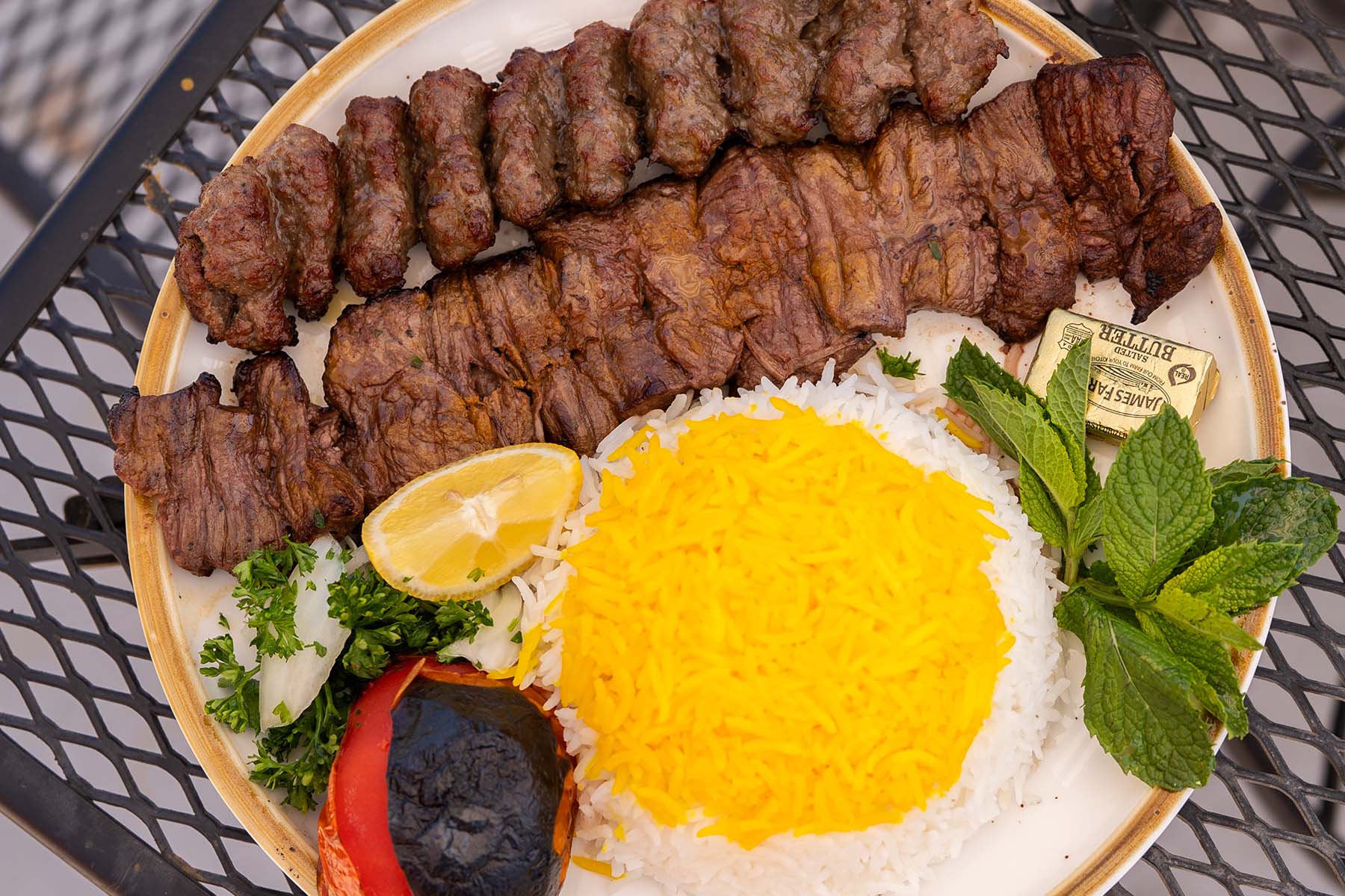 Double beef for the real meat lover—one skewer of marinated steak shish kebab, one rich, juicy ground beef koobideh. The flavors are smoky, savory, and bold. You get texture and depth in every bite, plus total satisfaction. Best choice for anyone who wants Persian food with a full punch.