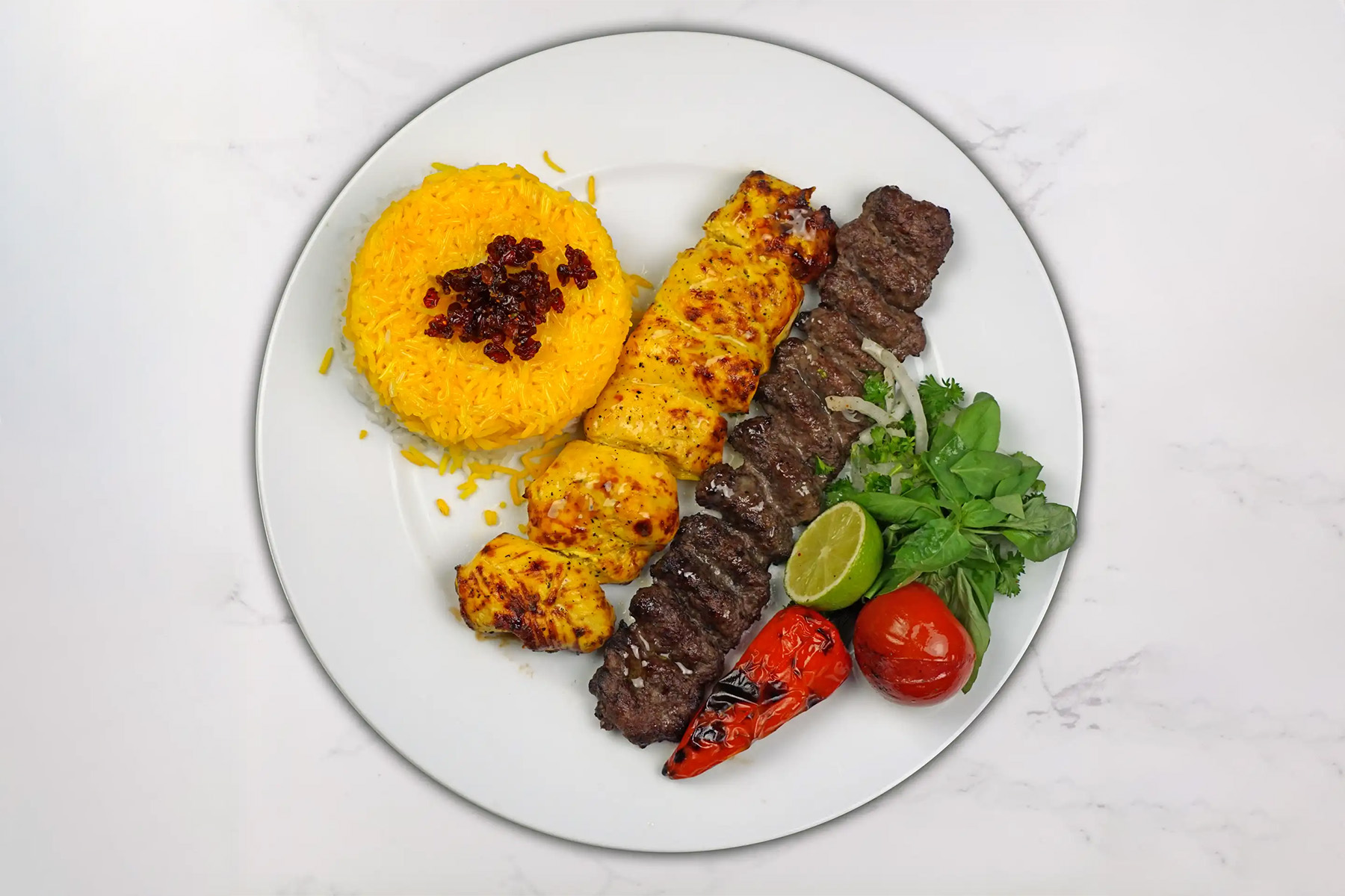 The Soltani is pure luxury—big, juicy pieces of boneless chicken on one skewer, plus a rich, smoky beef koobideh beside it. This double hit brings both tender chicken and bold beef flavor, served with rice or salad. Completely satisfying, high-protein, and classic Persian hospitality.