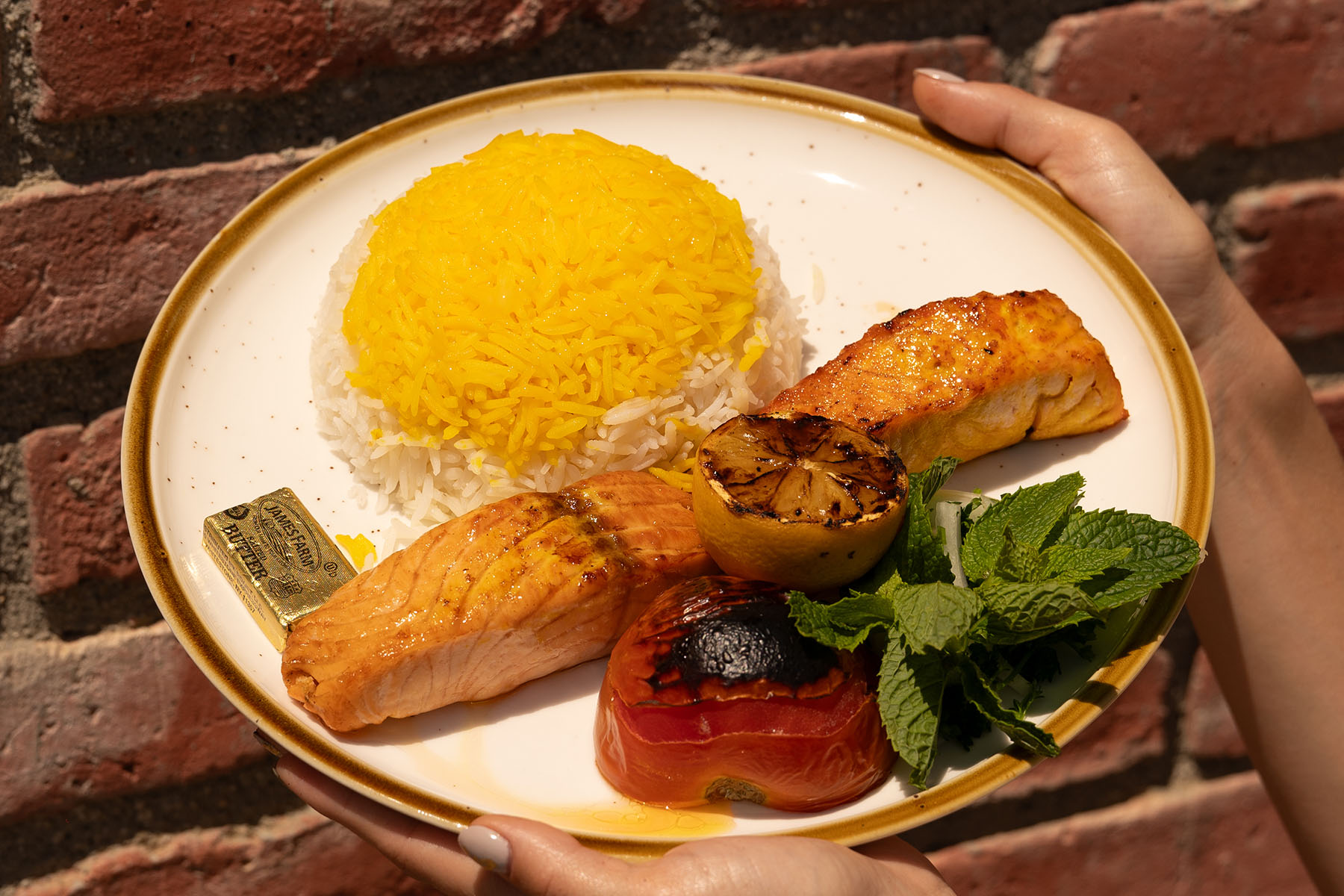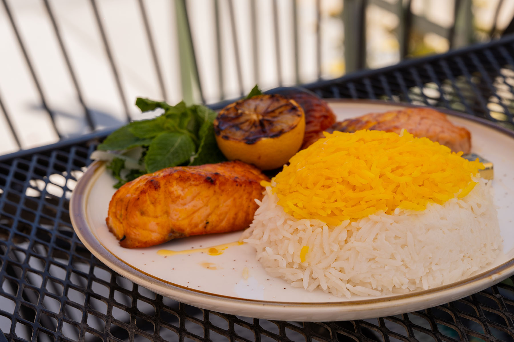 Parkway’s Grilled Salmon pulls zero punches. Center-cut, fresh—not frozen—filet, flame-grilled till the outside is just golden and the inside stays moist. You get this with Persian-style saffron rice, roasted tomato and grilled lemon, and a hit of fresh mint and onion. No dry flakes, no fishy smell, just buttery, clean flavor. This isn’t generic grilled salmon from a chain. It’s real food, real nutrition, and you actually want to finish every bite.